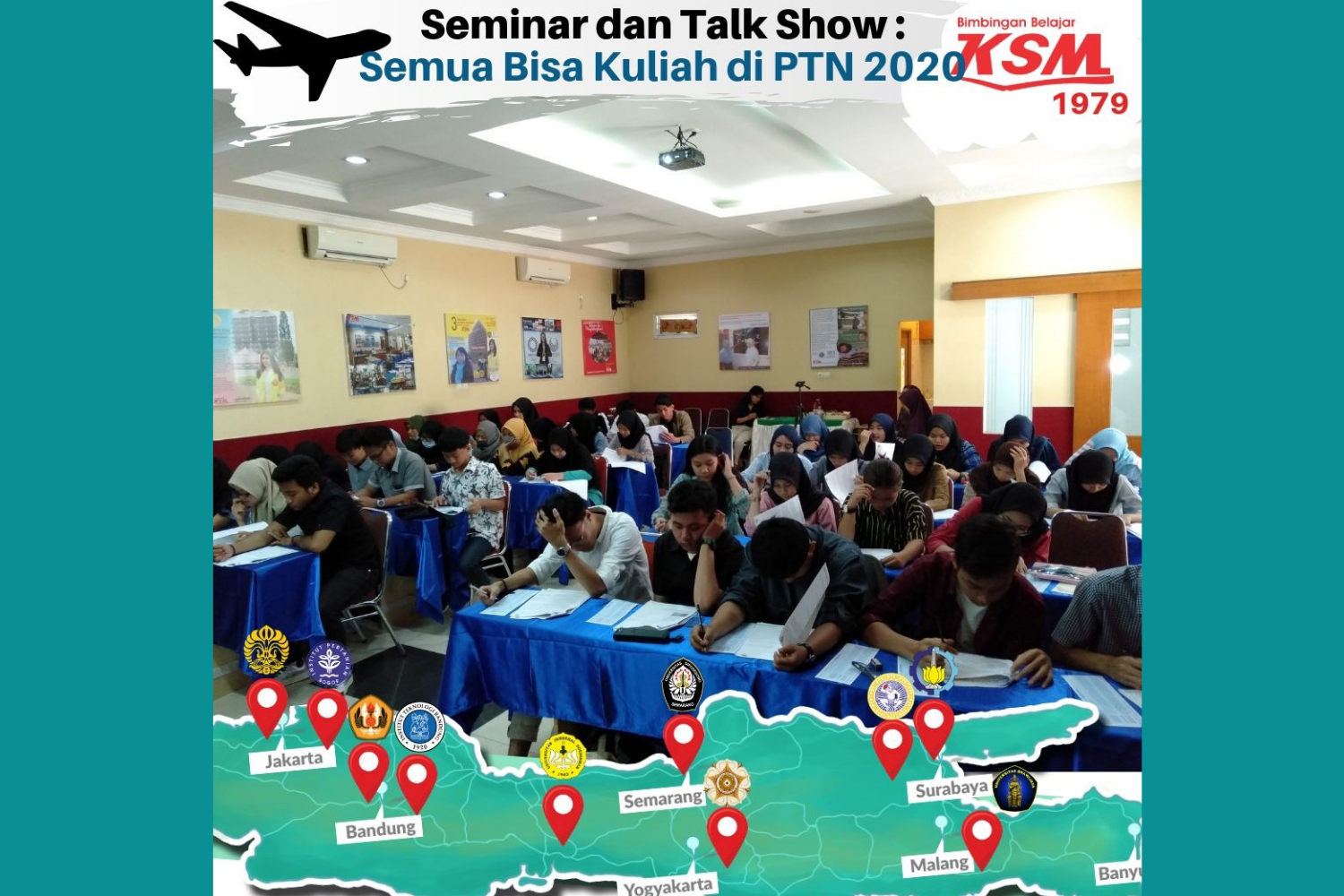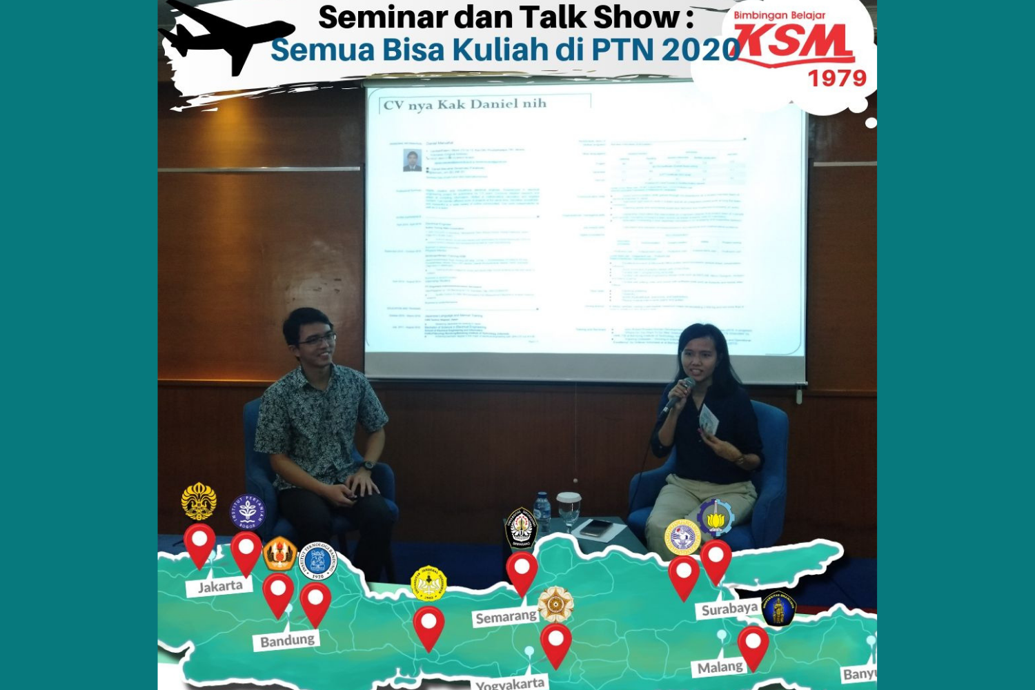 Awal Agustus 2019 ini, KSM Cabang Harapan Indah menggelar sebuah seminar dan talkshow bertajuk Semua Bisa Kuliah di PTN 2020 untuk kalangan umum. Setelah sukses dengan Seminar Tips & Trik TPA di tahun-tahun sebelumnya—2017 dan 2018, kali ini KSM Cabang Harapan Indah menghadirkan materi berbeda yang tentunya amat dinanti siswa kelas 12 SMA. Sebelumnya, pada Maret 2019, seminar ini juga telah digelar khusus untuk para siswa Kelas 12 SMA intern yang telah terdaftar untuk Tahun Ajaran 2019-2020. Pertengahan tahun ini, KSM mengemas acara ini menjadi lebih komplit serta mengundang pembicara yang memiliki segudang pengalaman luar biasa. Yuk, simak keseruan acaranya!