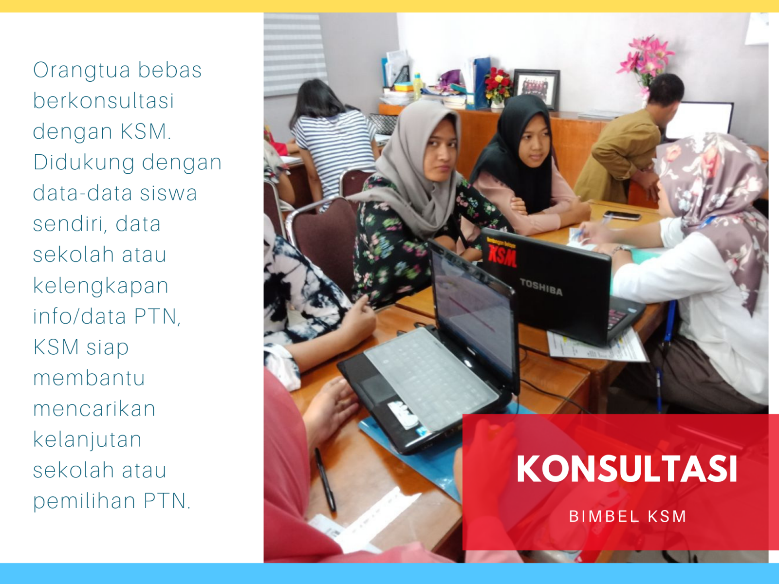 Orang tua bebas berkonsultasi dengan KSM. Didukung dengan data-data siswa sendiri, data sekolah atau kelengkapan info/data PTN, KSM siap membantu mencarikan kelanjutan sekolah atau pemilihan PTN