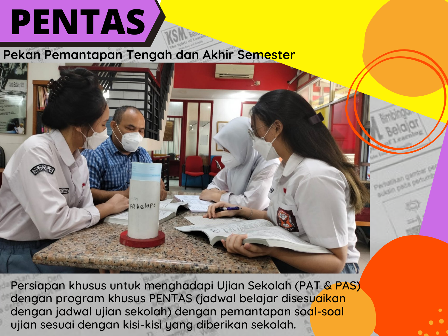 Persiapan khusus untuk menghadapi Ujian Sekolah (PTS dan PAS) dengan program khusus PENTAS (jadwal belajar disesuaikan dengan jadwal ujian sekolah) dengan pemantapan soal-soal ujian sesuai dengan kisi-kisi yang diberikan sekolah